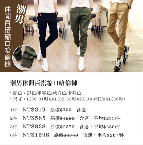 平均每件最低只要267元起(含運)即可購得潮男休閒百搭縮口哈倫褲1件/2件/3件/6件,多色多尺寸任選。
